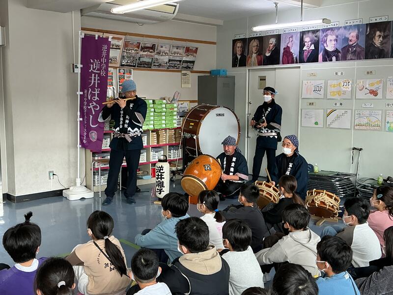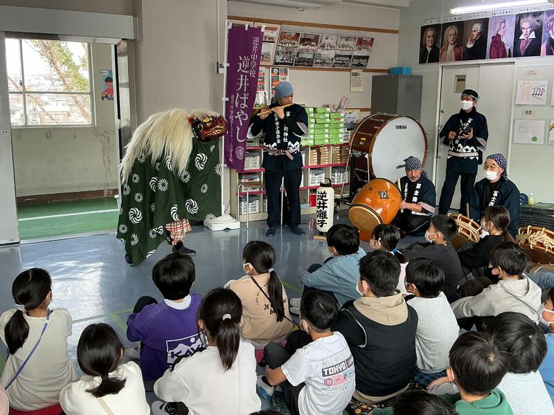 2月24日,4年生は音楽の「地域の伝統音楽」の学習として,「逆井囃子」の授業を行いました。講師は,「逆井囃子保存会」の皆さんとコミュニティスクールをはじめとした地域の皆さんです。