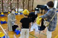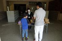 5月7・8の午前午後で2~6年生は1組2組を分散し、3カ所の昇降口て行われます。1年生は対面日も兼ねているので体育館で行いました。午前中は順調に配付が終了しました。次回は5月18・19日を予定しています。