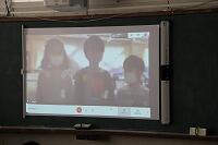 これは先月の学校探検の様子第2弾です。2年生が中継をして1年生に学校の様子を伝えます。校長室のいすに座る子もいました。
