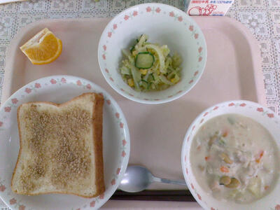 一覧へ 鶏肉と青大豆の米粉シチュー 日時 2026年01月15日(木) 公開対象 給食室から 詳細 牛乳 セサミトースト 鶏肉と青大豆の米粉シチュー キャベツとコーンのサラダ 伊予柑(かんきつ果物) 今日の米粉シチューには,青大豆が入っています。黄大豆とは異なり,熟しても緑色のままで,鉄分や食物繊維が多く含まれます。また,柏市でとれたかぶが入っています。柏市はかぶの生産量が全国第1位です。 作成者 藤心小学校管理者 更新日時 2026-01-15 12:09:24