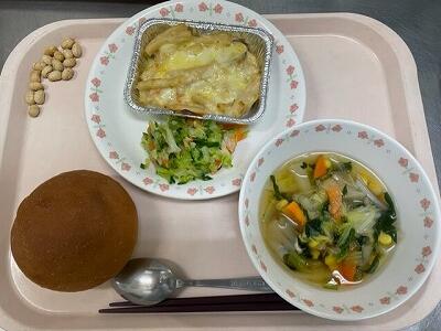 一覧へ 今日の給食 日時 2023年06月13日(火) 公開対象 給食室から 詳細 ・牛乳 ・丸パン ・米粉のマカロニグラタン ・ドレッシングサラダ ・野菜とコーンのスープ ・いり大豆 作成者 藤心小学校 更新日時 2023-06-15 12:34:53