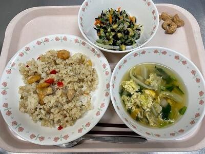 一覧へ 今日の給食 日時 2023年06月21日(水) 公開対象 給食室から 詳細 ・牛乳 ・ナシゴレン ・ひじきと青大豆のマリネ ・白菜と卵のスープ メープルカシューナッツ 作成者 藤心小学校 更新日時 2023-06-23 13:27:09
