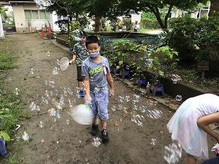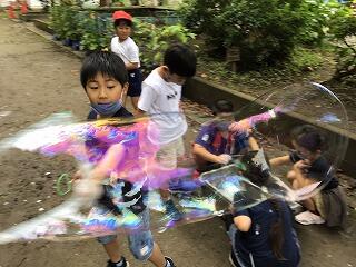 しゃぼん玉づくりでは、うちわで小さなしゃぼん玉をたくさん作ってとてもきれいでした。ハンガーと毛糸を使って大きなしゃぼん玉にも挑戦しました。毛糸を巻き付ける作業がなかなかうまくいかず,苦戦しましたが,頑張って最後まで作りました。見事に大きなしゃぼん玉ができたときは,みんな大喜びでした。