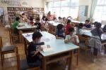 栄養士の「やさいのがっこう とうもろこしちゃんのながいかみ」の読み聞かせを聞いたり、