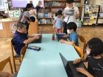 本の分類をヒントに、本棚を探し歩きます。景品は「3冊借りられる券」でした。