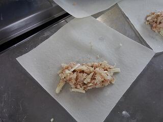 ツナ、ピザチーズ、粗みじんの玉ねぎとれんこんを合わせて、春巻きの皮で包んでいます。
