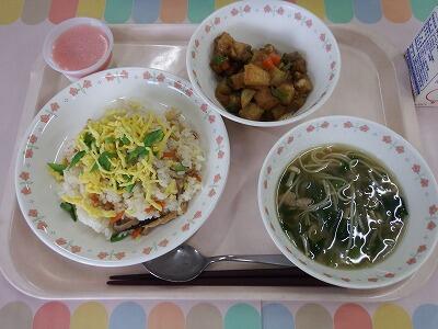 一覧へ 【ひなまつり】ちらし寿司 日時 2026年03月02日(月) 公開対象 給食室より 詳細 牛乳 ちらし寿司 タラと野菜の揚げ煮 すましそうめん汁 三色ゼリー 今日は一日早いひなまつり献立です。 ゼリーは菱餅カラーにしました。三色は、緑色の新芽の上に、白い雪が降り、ピンクの桃の花が咲いている様子を表しています。 ゼリーは緑色が抹茶ミルク、白色がミルク、桃色がいちごミルクになっています。 児童にも好評でした。 作成者 花野井小学校管理者 更新日時 2026-03-02 16:12:00