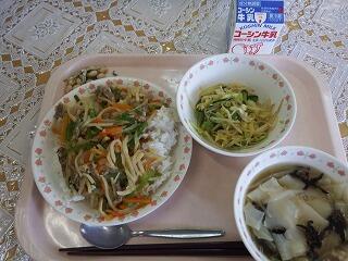 一覧へ チンジャオロース丼 日時 2023年01月26日(木) 公開対象 給食室より 詳細 牛乳 チンジャオロース丼 春雨サラダ ワンタンスープ 大豆小魚 作成者 花野井小学校管理者 更新日時 2023-01-27 15:01:33