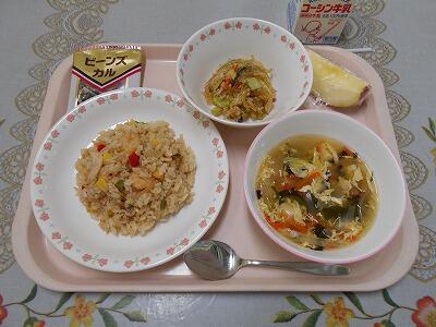 牛乳 ナシゴレン 春雨とぶた肉の炒め物 たまごスープ りんご 大豆小魚