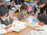 1年生は麗澤幼稚園児を招いて交流会をしました。一緒に折り紙をしたり、松ぼっくりけん玉で遊んだり、ランドセルを背負わせてあげたりしながら活動しました。