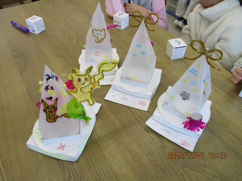 プラスチック素材にセロハンやモールなどを飾りつけし、自分の想像を広げながら、楽しそうに作業していました。