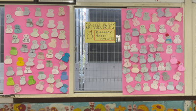 できあがった雪だるまは、みんなで廊下にペタペタ掲示。