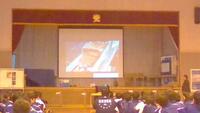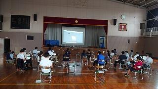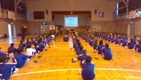 3年生は体育館で、1・2年生は教室でオンラインで参加しました。