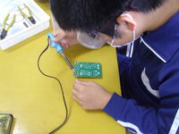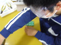 写真は,2年生が安全めがねをした上で,はんだ付けをしています。