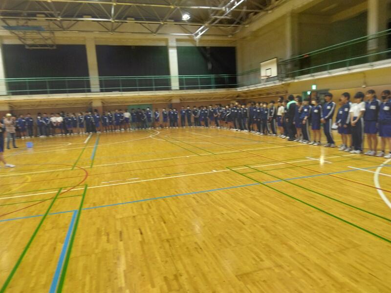 夕方から、体育館でスタンツ、フォークダンス、ダンス、斉唱をしました。