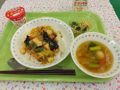 一覧へ 豆腐入り中華丼 日時 2026年02月16日(月) 公開対象 給食室・献立(写真付き) 詳細 豆腐入り中華丼 ゆで野菜のごまサラダ うずら卵入り春雨スープ ヨーグルト 牛乳 作成者 光ヶ丘中学校管理者 更新日時 2026-02-17 12:28:30