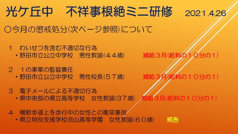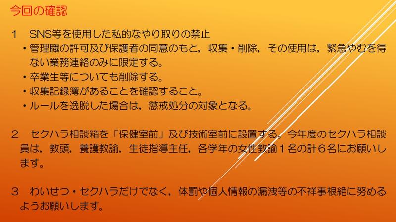 本校では,毎年,学期に1回以上,外部講師や管理職を講師にした研修会の実施や職員会議,打合せ等を活用したミニ研修会,ボトムアップ式の研修会を行い,学校から不祥事をなくすための取り組みをしております。これまでの取り組みの一部の紹介と今後も研修会の様子を掲載していきます。