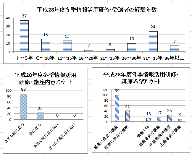 先週は12月実施の「冬季情報活用研修講座」の様子を載せた。2日間、4コマの講座では終了時に毎回アンケートに答えていただいた。その結果からいくつかを紹介したい。