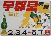 競馬、競輪、ボート、オートレースなどの公営ギャンブルの広告は当時の定番ポスターだった。ここには船橋競馬(昭和29年)と宇都宮競輪(昭和31年)の広告を載せたが沿線各地で開催されるレース案内が頻繁に車内に掲示された。昔からギャンブルは人間にとって魅惑的なものであるが、はまり過ぎない心がけが大事あろう。そろそろこの前回東京五輪の頃の車内広告シリーズも終わりが近づいた。