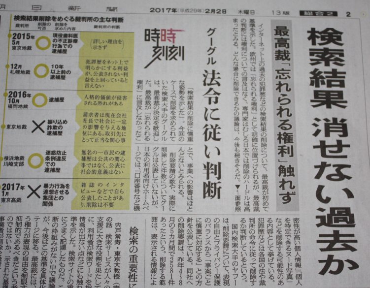 2月2日の新聞記事を見ていただけただろうか。自分の名前をネット検索したら、犯罪歴が載っていて、これを削除するよう求めた裁判で削除を認めないとの判決である。情報公開の方が優先する事例だということだ。