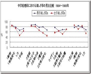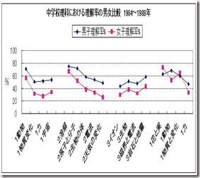 授業中の様子や定期テストなどから中学生では男子より女子の方が理科が苦手だといわれている。ではこの調査結果では男女差はどのようになっているだろうか。多くの理科教員の感じ方と一致するであろうか。また、差があるとしたらどれ位あるのだろうか。