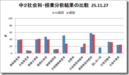 長年にわたり分析してきた者と最近始めた者で同一の授業を見て分析した結果の言語比率グラフを示す。これまで常に注目してきた「教師発言率」と「生徒活動率」の誤差を比較するとプラスマイナス2%に収まることがわかる。500回を超える者でも10回程度の者でもこの程度なら本法の信頼性は高いといえよう。