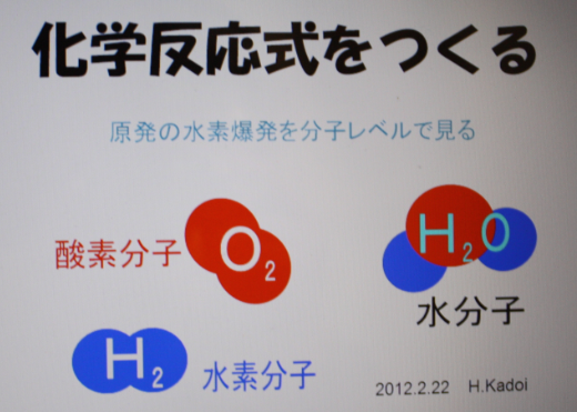 原子記号や化学式はこの化学反応式を作るための準備であった。最終段階の化学反応式を理解するには先の二つの準備が欠かせないことはいうまでもない。とはいうものの、化学反応式にはそれ自体の面白さもある。それを味わえるのがこのアニメーションであると思う。