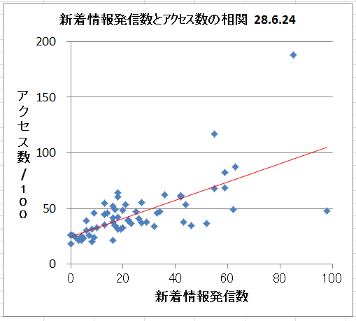 学校が「打てば」保護者に「響いた」のだろうか、それを検証してみる。下図は6月1日から24日までの市内小中学校毎の新着情報発信数とアクセス数を散布図にしたものである。点の並びから正の相関が認められる。図は他にも示唆してくれる、じっくり見てほしい。