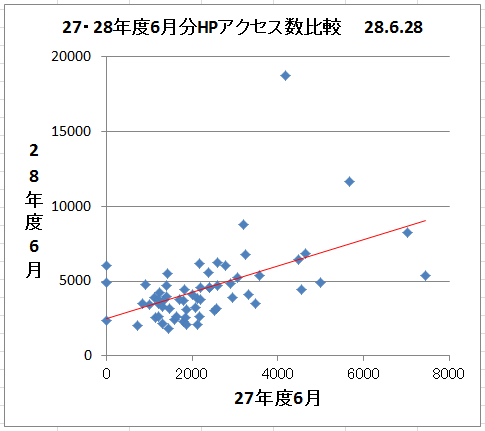 前回は今年6月の各学校の新着情報発信数とアクセス数の相関関係について述べたが、昨年6月と今年の6月のアクセス数の相関はどうなっているだろうか。
