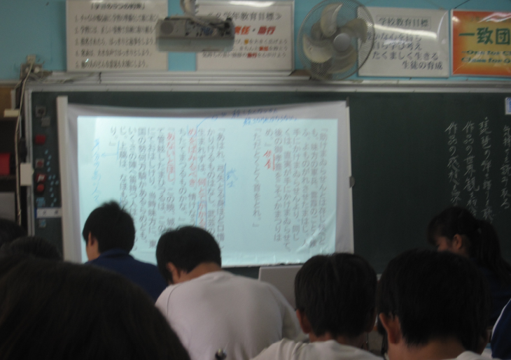 最近、中学校初任者の授業をいくつか参観する機会があった。なかなかICT機器を授業で使うのは経験を積んだ先生でも難しいものがあるが、特別教室でプラズマ電子情報ボードを利用し、パワーポイントでの自作資料を使ったり、教室に常設されたプロジェクタで教科書の本文を拡大表示させ、朱筆を加えるなどの授業をみることができた。