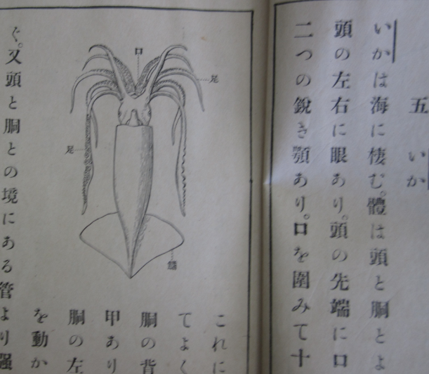 明治43年に発行された尋常小学理科書、国が初めて発行した6年生用国定教科書の挿絵も下の写真のように足が上になっている。イカの足は頭の上に付き、頭の下に内臓、いわば胴が付いている。頭足類といわれるゆえんである。100年以上も前から教科書は変わっていない。この不思議さが授業で生徒に伝わっているのだろうか。