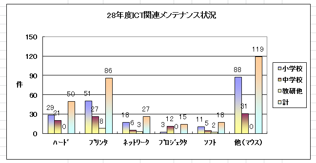 10月末現在、市内小中学校62校が、ウチダエスコにICT関連で修理等を依頼した件数は315件に上った。件数は例年とほぼ同じ数である。必ずしも導入年度が古いから多いとはいえず、導入年度に依存しない傾向は5年以上続いている。