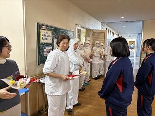 今日、3年生は感謝を伝える集会を行いました。ひとつ目は、「授業では直接教わらなかったけれど、3年間の学校生活を支えてくれた職員を招いての集会」です。合唱「story」を発表した後、一人一人にメッセージを渡しました。もうひとつは、給食室のみなさんへの感謝の集会です。給食委員が代表であいさつし、色紙と花束を贈りました。3年生は、多くの方々への感謝の気持ちを胸に、12日に行われる「卒業式」の練習に全力で取り組んでいます。
