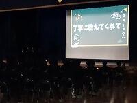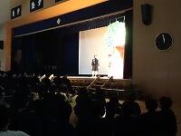 お世話になった先生方が入場しました。スクリーンの文字は、「感謝とは何か」。
