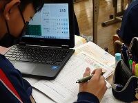 今日の課題は「47都道府県のデータを読み取りグラフをつくろう」です。写真は図書資料を使い,調べるものの度数分布表を作成しているところです。