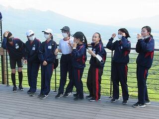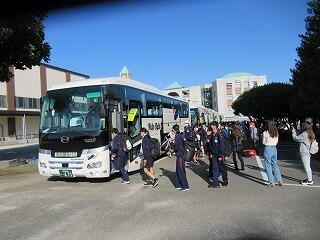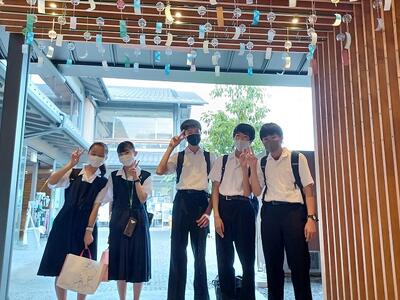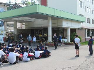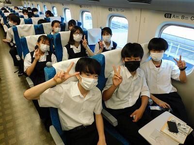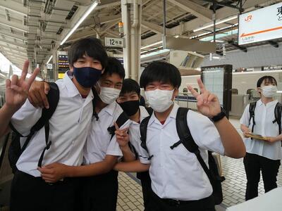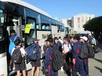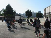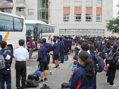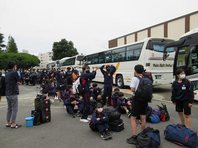 朝7時、雲一つない青空の下、2年生142名が林間学校に出発しました。