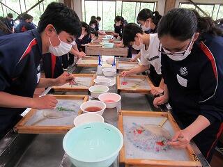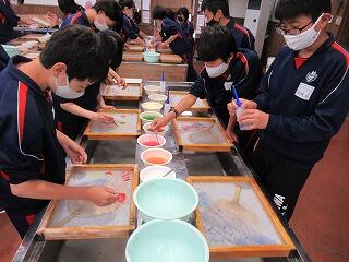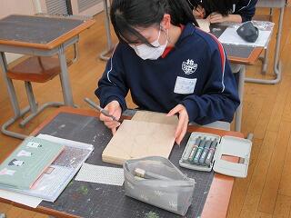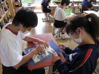 3年生の理科では,動滑車を使って物体を持ち上げるとき,力は半分に距離は2倍になることが実験で分かりました。美術では,回転版画を制作しています。回転版画は,正方形の板に彫刻刀で彫った後,版木を回転させながら刷りを重ねていく版画です。図柄が90度回転しながら重なっていきます。その時,彫りと色が重なって予想外の効果が生まれる題材です。現在,国道6号線の地下道に先輩の作品が展示してあります。今制作している作品は,今冬に掲示する予定です。