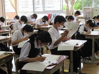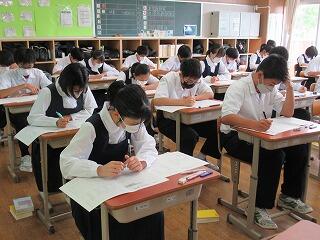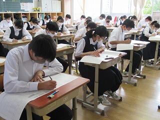 3年生は,今日と明日が第1回定期テストとなります。今日は国語,英語,明日は数学,理科,社会です。受験生でもあり,みんな真剣に取り組んでいます。