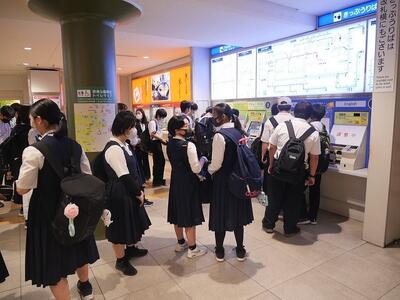 ほどなく雨が降り始めました。慣れない交通機関に戸惑いながらも、班で協力して研修に臨んでいます!