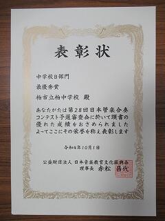 10/1,2に陸上競技の千葉県新人大会が行われました。柏市の代表として女子1500m,女子100m,男子砲丸投の3名が出場し,女子1500mで7位入賞を果たしました。また,柏市新人戦も行われました。10/1は男子ソフトテニスの個人戦,女子バスケットボールの準々決勝が行われました。男子ソフトテニスは優勝し,県大会へ出場することになりました。女子バスケットボールは逆井根中に敗れ,ベスト8で敗退となりました。10/2は女子ソフトテニスの団体戦とサッカーの予選リーグが行われました。女子ソフトテニスは2回戦で南部中に勝利しましたが,準々決勝で柏五中に敗れ,ベスト8で敗退となりました。サッカーは大津ヶ丘中に敗れ,予選リーグ1勝2敗で敗退となりました。