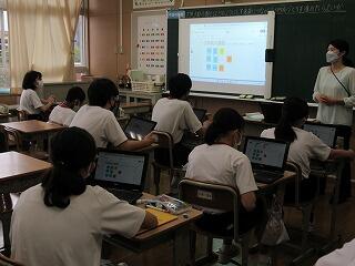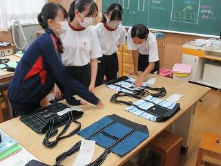 2年生の社会では,大都市圏での未来につながる地域づくりについて,端末を使って情報を収集したり,意見を交換したりしながら学習していました。1年生の国語では,自分の推し本のブックトークをしました。3年生の音楽は,アルトリコーダーの演奏の練習とテストをしました。1年生の技術は,木製ラックが組み立ってきました。2年生の家庭では,完成したトートバッグを鑑賞し合いました。