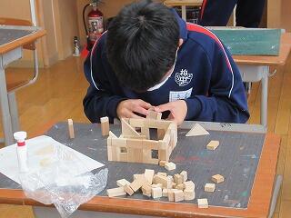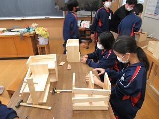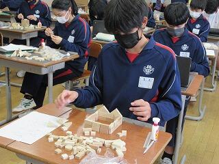 3年生の美術では,マイドリームハウスを設計して,様々な形の木片を組み合わせて製作を始めました。
