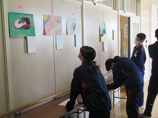 2年生の美術では,マイシューズの絵が完成しましたので,お互いに鑑賞し合いました。