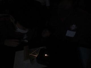 1年生の理科では,理科室を暗くして光の進み方について調べていました。