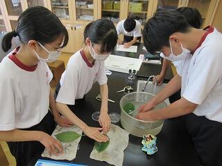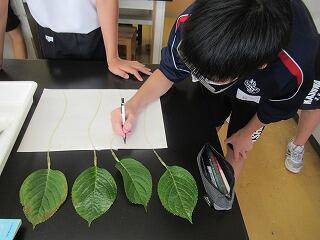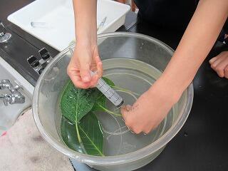 2年生の理科の授業では,葉からの蒸散と水分の吸収について調べました。葉の表,裏,両面にそれぞれワセリンを塗って気孔をふさいで水分の吸収量を比べ,蒸散はどの部分で主に起こっているのか考察しました。