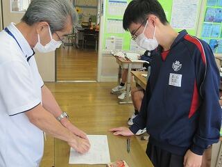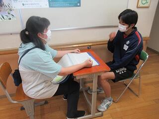 3年生の校長面接が始まりました。受験等での面接練習として,生徒と校長の一対一で行います。面接のマナーや自己表現力の向上を図ります。1組から順に11月までに全員と行います。また,進路希望の決定に向けて,時間を見つけては担任と生徒の相談・面談を随時行っています。