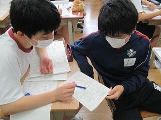3年生の理科の授業では,遺伝の規則性について調べました。モデル図を描きながら,あるいは割箸で遺伝子モデルをつくり,出現する形質について,一人で,仲間と,先生と考えました。
