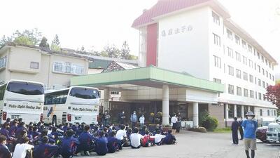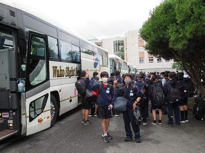朝7時、雲一つない青空の下、2年生142名が林間学校に出発しました。