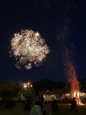 キャンプファイヤーでは大きな花火が打ち上がり、盛り上がりは最高潮に!