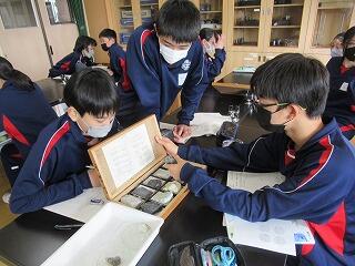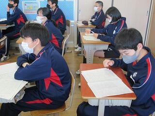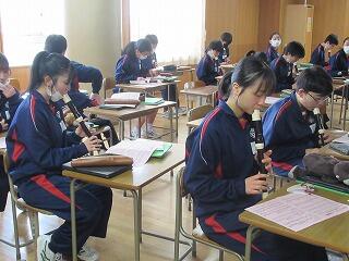 3年生の約2/3の生徒が,今日と明日の公立高校入試に臨んでいます。教室には,たくさんの空席がありちょっとさびしそうです。受験生の検討を祈ります。1,2年生は,通常の授業を行っています。先週実施した定期テストの答案の返却が始まっています。2年生の社会では,歴史で国境と領土の確定はとう進められたのか調べていました。1年生の理科では,堆積岩のつくりについて調べていました。